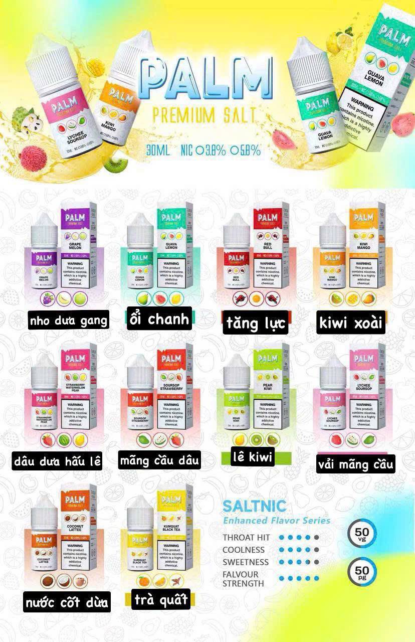 Nếu bạn đang tìm một dòng tinh dầu Salt Nic ngon – bền – mượt thì PALM chính là lựa chọn hoàn hảo. Mỗi hương đều được pha trộn chuẩn tỉ lệ, cho hương vị chân thật, hậu vị sâu, giúp bạn chill đúng điệu với từng hơi pod.